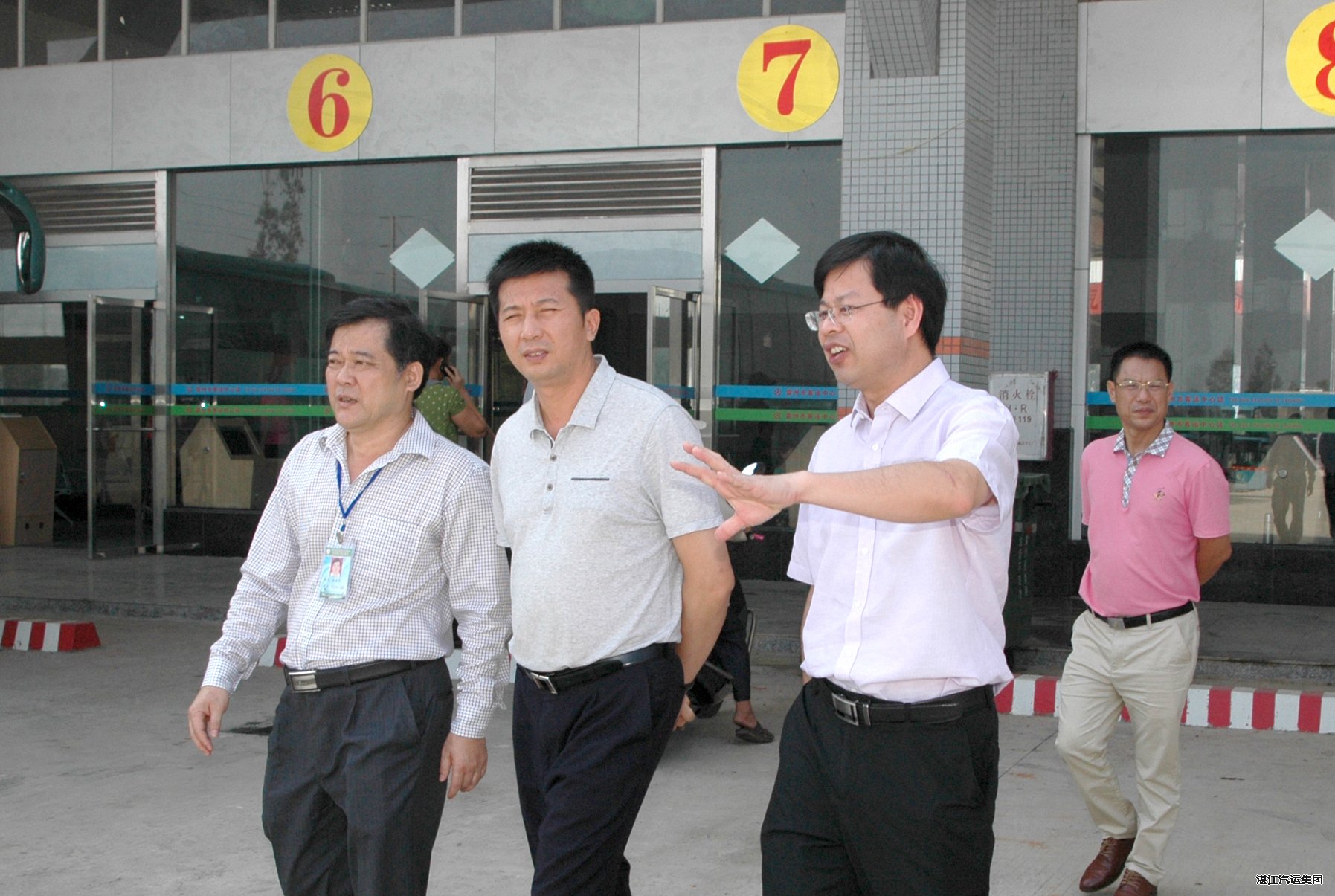 集團(tuán)公司總經(jīng)理吳定義(右二)陪同雷州市委常委梁忠興(右三)視察雷州總站新站。